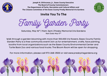 Walk through a garden blooming with more than 100,000 iris flowers. Essex County Family Garden Party is a free community event! Join us for entertainment, crafts, face painting, booths from local organizations such as the Essex County Environmental Center and Turtle Back Zoo and various food trucks. The Bloom Room will be open for shopping.